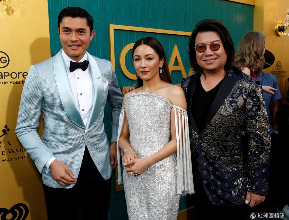 在美國加州洛杉磯的《瘋狂亞洲富豪》電影首映會上,原著小說作者關凱文(右)和男女主角合影。