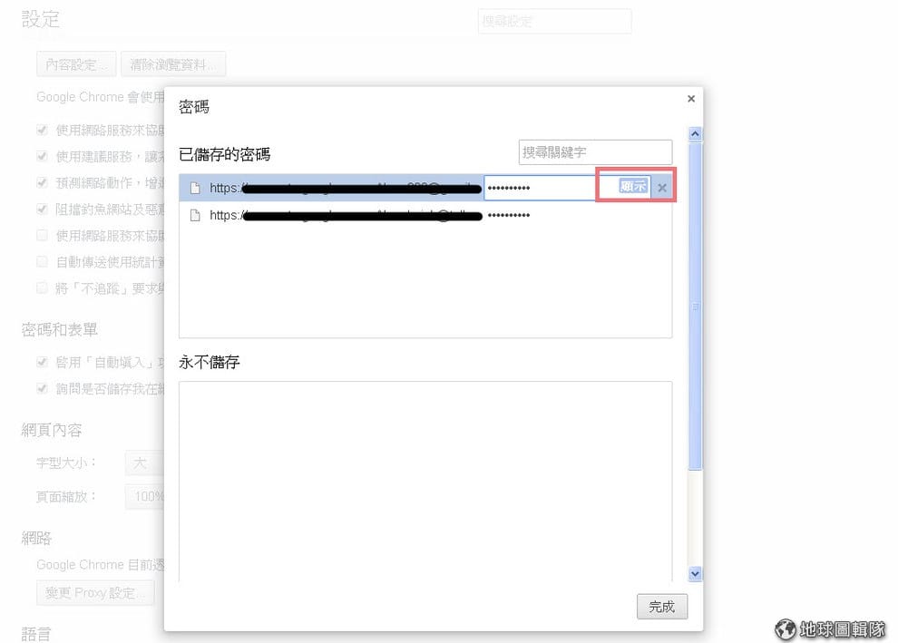 編輯實際使用,在Chrome的設定頁面按下顯示後就會看到密碼出現。
