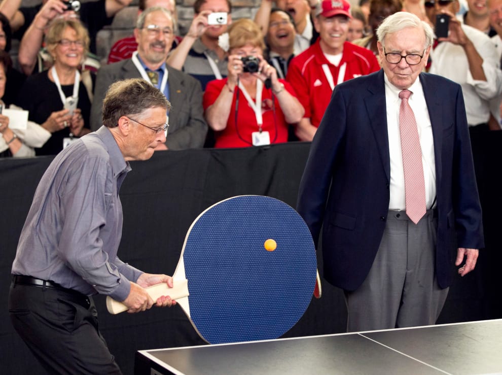 在 2012年,巴菲特波克夏海瑟威控股公司股東大會前夕,前來參加會議的比爾蓋茲在和巴菲特打完桌球後,意猶未盡地拿起超大桌球拍打起球來。兩人認識已經超過 20年。