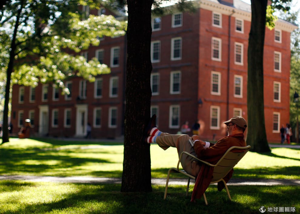 在哈佛大學校園內,一名男子悠閒地把腳翹在樹上休息。