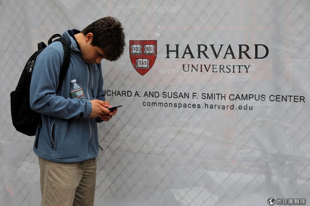 一名男子在哈佛大學低頭用手機。近日,美國司法部出面相挺亞裔學生告哈佛,認為哈佛在審查申請者入學資格時,有種族歧視之嫌。