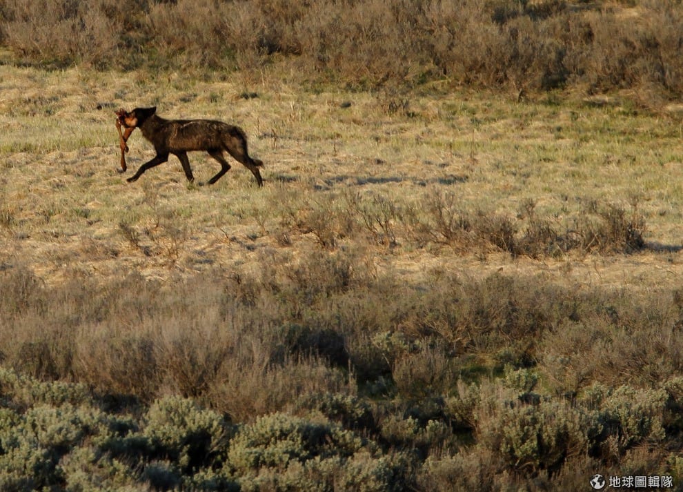 嘴裡叼著馬鹿腳的狼,走在黃石公園的海登谷(Hayden Valley)。