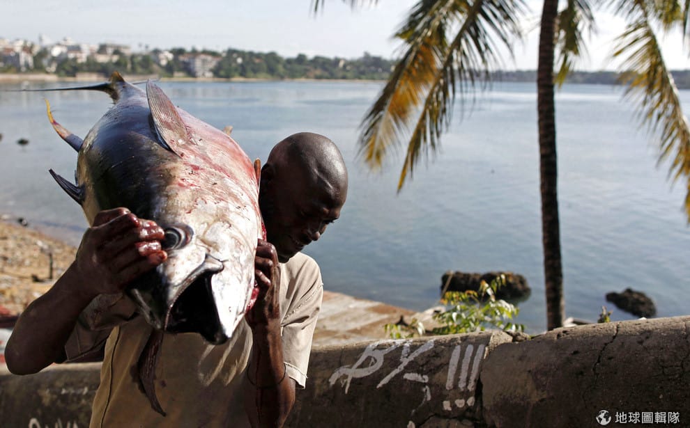 2010年,一名漁夫準備把捕到的魚扛到市場販售。