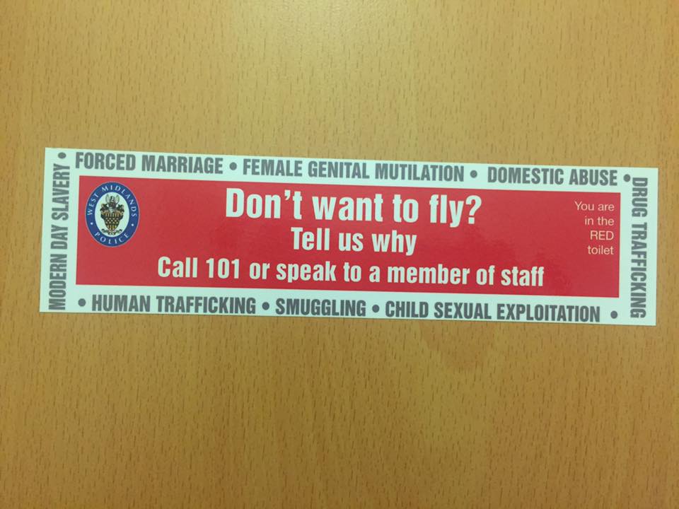 潘姆也說到,除了伯明罕機場這次推出的廁所隔間貼紙之外,英國各地的機場工作人員都會佩戴紅色三角形的識別徽章,來提醒民眾提高警覺。邊境管理局的工作人員會隨機問民眾說:「你知道這個(紅色三角形)是什麼意思嗎?它代表什麼?」
