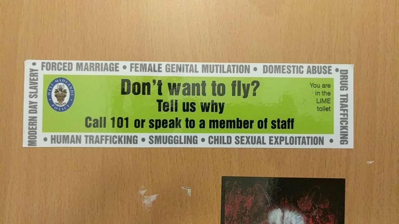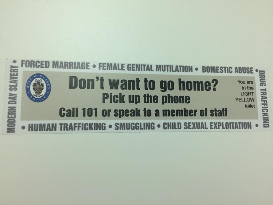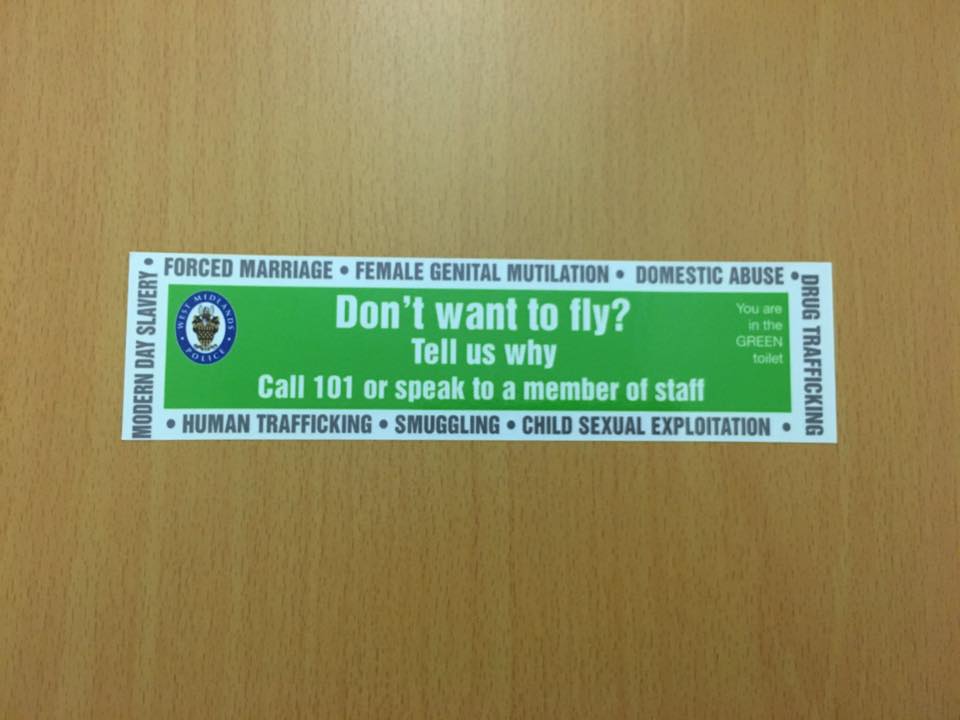 圖為英國伯明罕機場新增的彩色貼紙標示,這間是「綠色」廁所。在這些彩色貼紙最外圍的文字上,順時鐘方向列出了強迫婚姻、女性割禮、家暴、運毒、兒童性剝削、走私、人口販運、現代奴隸制度等。