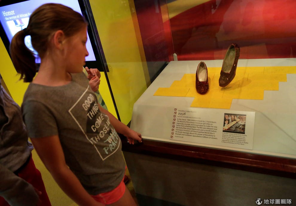 2017年4月,一名小女孩來到美國國家歷史博物館欣賞四雙紅寶石鞋中的其中一雙。