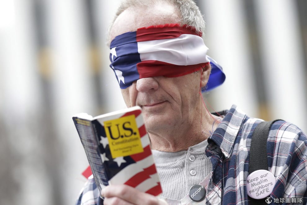 2015年12月,一名反川普的民眾用美國國旗蒙住雙眼,手拿美國憲法閱讀。