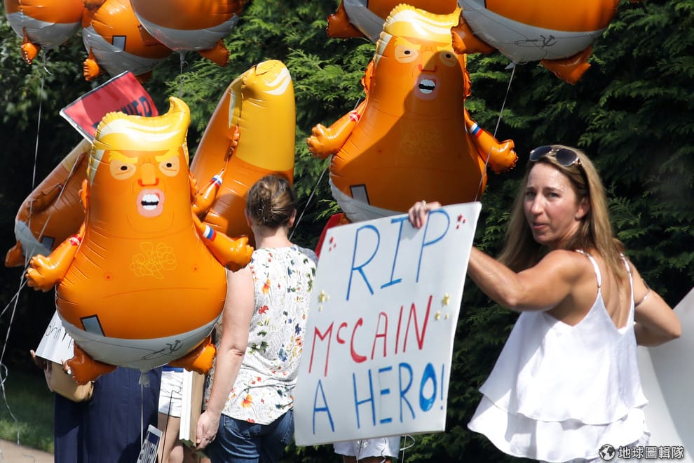 1號這天,在維吉尼亞州勞登郡史特靈區(Sterling)的川普國家高球俱樂部外,不滿美國總統川普(Donald Trump)的民眾手持川普寶寶氣球,等待川普的車隊經過。