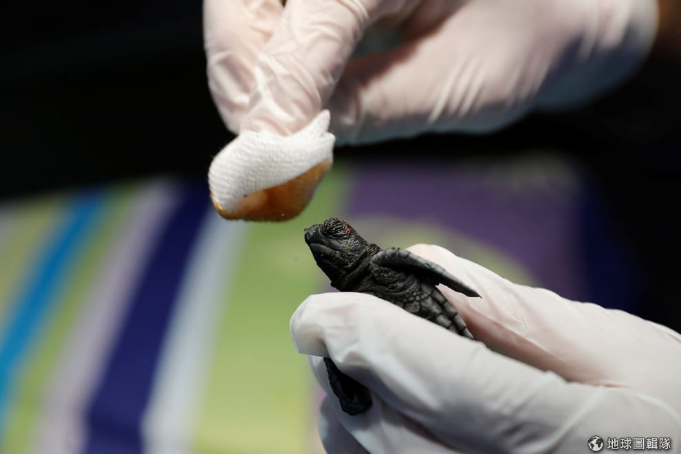 路透社海龜救援中心的主席卡斯卡小心地幫受傷的小海龜套上頭套,在海龜救援中心成立後,卡斯卡就自願成為該組織的主席。