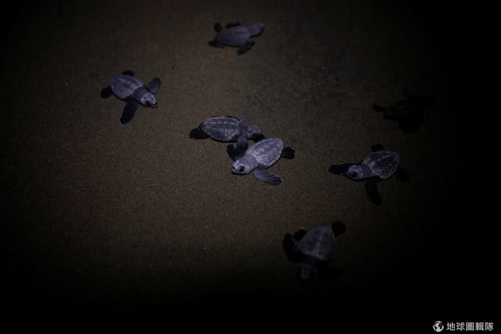路透社畫面中已經孵化的小海龜們,正忙著要爬到海裡去。