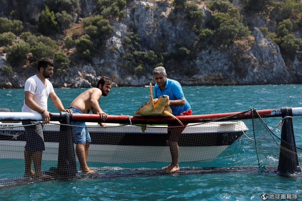 海龜救援中心的工作人員合力把一隻受傷的海龜抬起來,準備進行更多檢查。