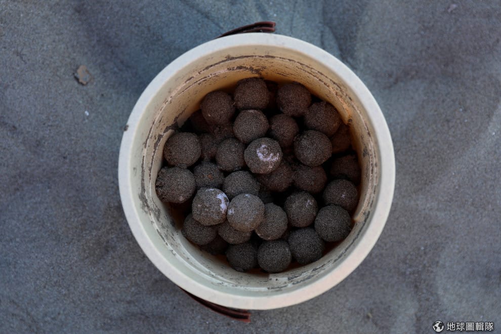 整理好的海龜蛋被放在桶子裡,準備移至他處。