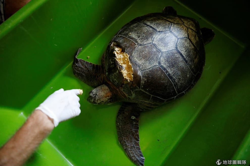 「海龜救援中心」正在照顧一隻受傷的海龜,牠的龜殼被船的螺旋槳擊中裂開。工作人員隨後以注射蜂蠟的方式修補龜殼。