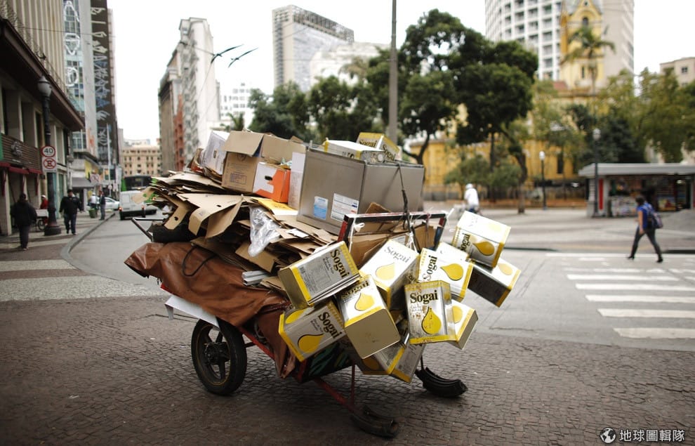 在巴西聖保羅市,一名媽媽在深夜拉著資源回收車前進,車上除了載著資源回收物,還有她的兩個兒子。