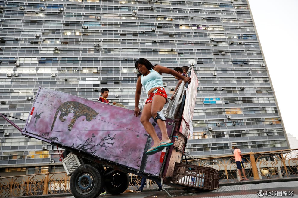 在巴西聖保羅市,一名資源回收者從她的推車上跳下來,這份工作賺得錢不多,付出的勞力卻相當驚人。