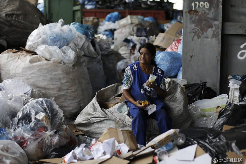 在巴西聖保羅的資源回收處,今年 60歲的資源回收者妲席瓦爾(Lucia da Silva)稍作休息,待會準備繼續將資源回收物分類。