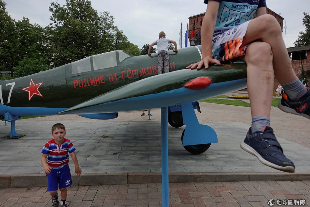 今年 7月在城市下諾夫哥羅德(Nizhny Novgorod),孩童們在蘇聯風格的戰機玩耍著。