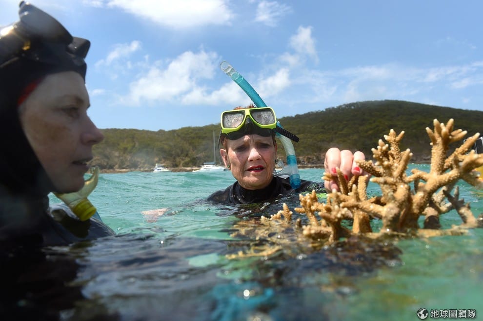 圖為 2016年11月25日,在澳洲大堡礁,海洋科學家瓊斯(Alison Jones,圖左)在向單一民族黨的黨魁韓森(圖右)講解珊瑚白化的問題。
