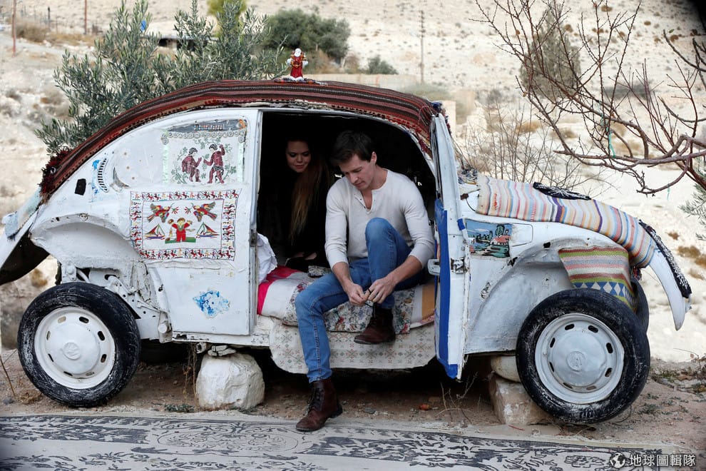 在約旦,一名美國觀光客正在綁鞋帶,準備從號稱「全球最小的飯店」退房,而這間飯店就是一台帶有當地傳統風情的福斯金龜車。