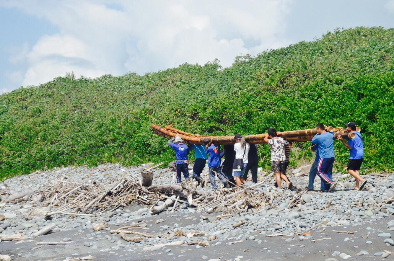 圖為 2018年6月,「三萬年前的航海計畫」在台灣進行竹筏測試時,大家扛著竹筏往前走。