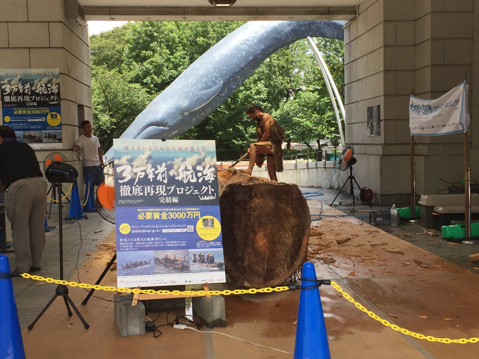 網友3万年前の航海 徹底再現プロジェクト圖為今年 8月,在日本東京的國立科學博物館正門外,舉辦「三萬年前的航海計畫」特別活動,經過的民眾可以看到身穿獸皮衣的工作人員一下一下地鑿著獨木舟。