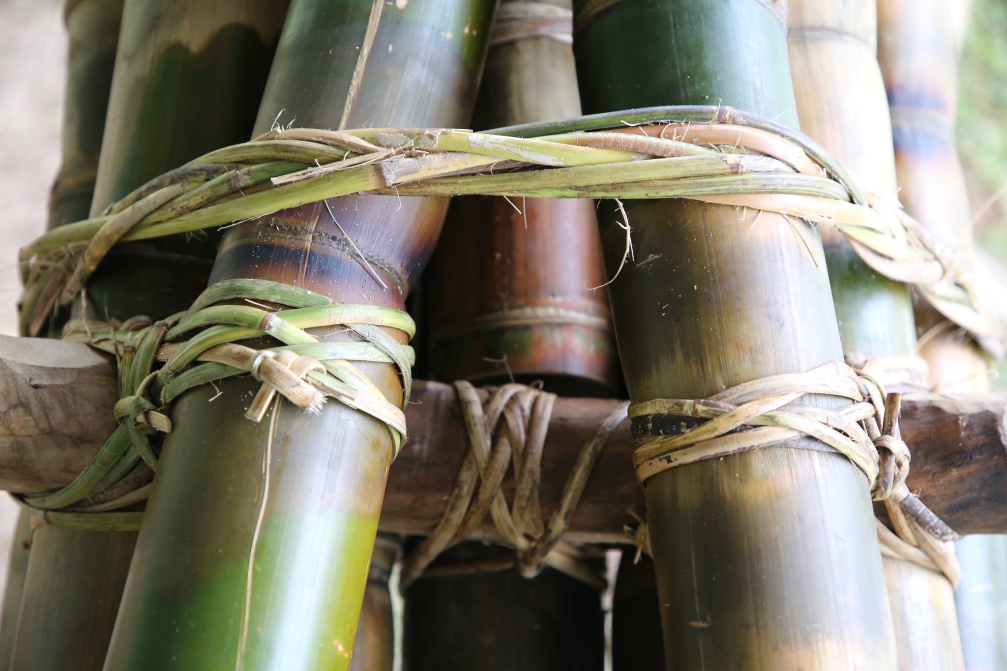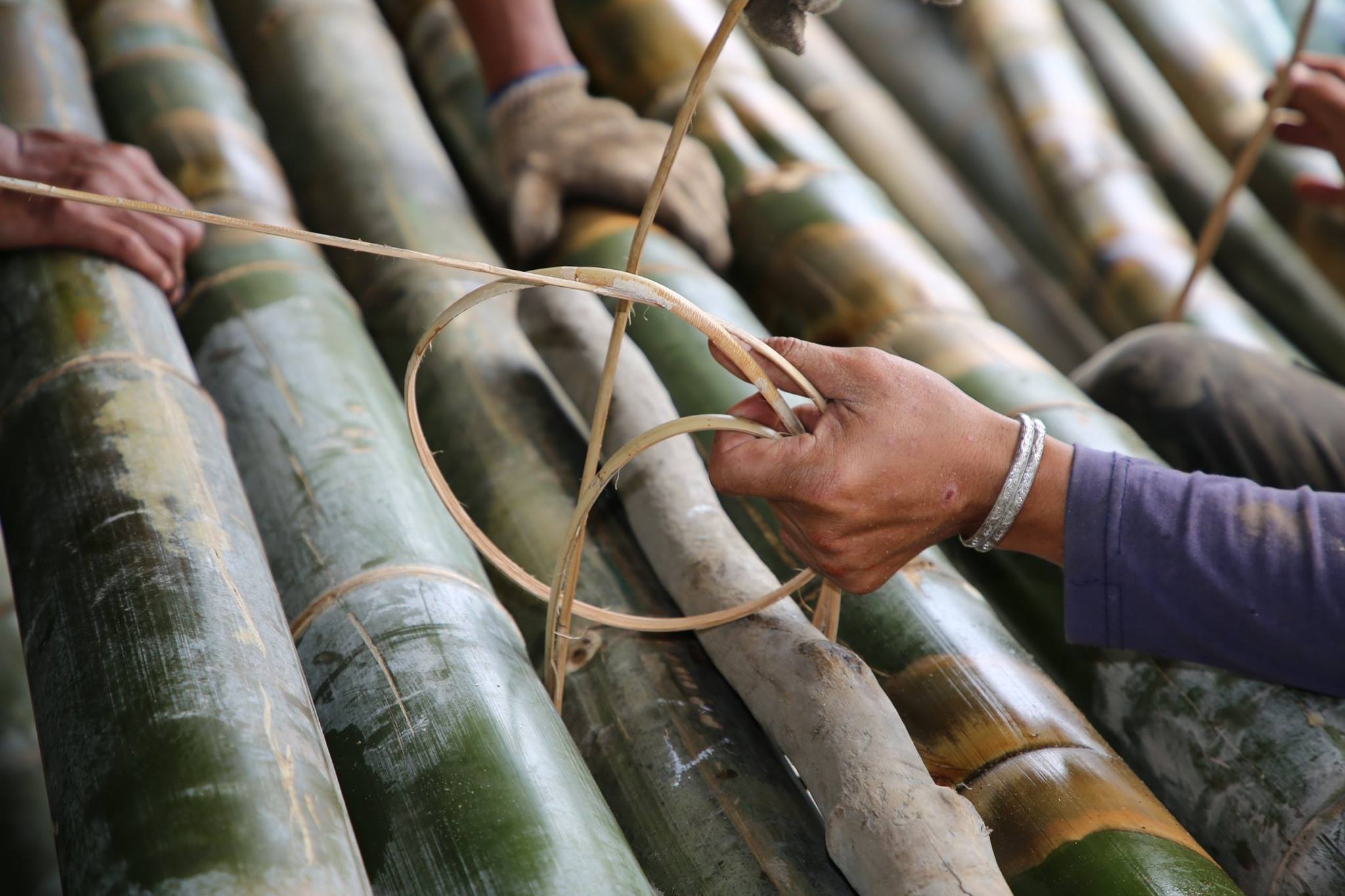 網友3万年前の航海 徹底再現プロジェクト竹子間的竹子固定方式,也是依循傳統使用劈好的竹片當成繩子固定。