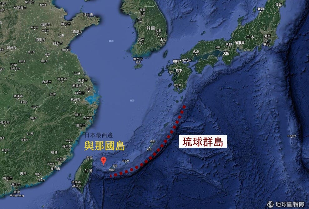 地球圖輯隊圖為台灣、琉球群島和日本西半部的地圖,暗紅色虛線部分為琉球群島的火山島弧方向,紅色標記處則為日本最西邊的「與那國島」,也是這次「三萬年前的航海計畫」的舞台:如果古人真的有辦法從台灣划到琉球群島的與那國島,才有可能沿著琉球群島一路北上到日本。
