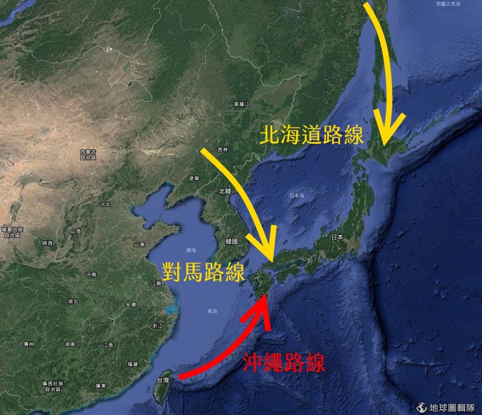 圖為目前學術圈上猜測,智人抵達日本的三種可能路徑。相較於從庫頁島南下抵達北海道的「北海道路線」,或從朝鮮半島越過對馬海峽的「對馬路線」,從台灣乘著黑潮先到沖繩再到日本的這條路徑是最艱困的,也是這次「三萬年前的航海計畫」要挑戰的目標。