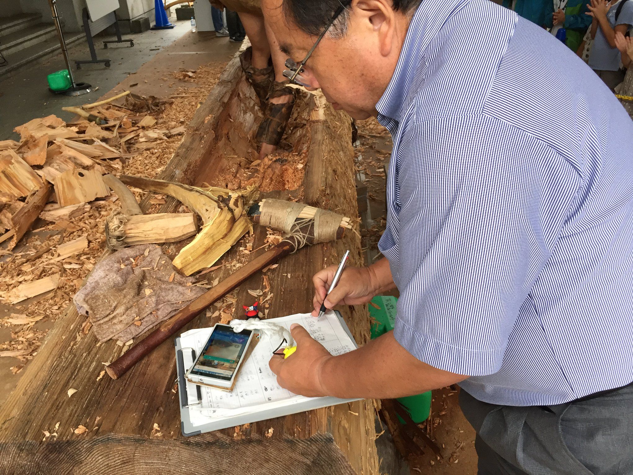 圖為今年 8月,工作人員正在記錄獨木舟的打造情況。「三萬年前的航海計畫」在製作獨木舟時,會紀錄下每下敲打是用哪一根斧頭、怎麼敲、敲了幾次。