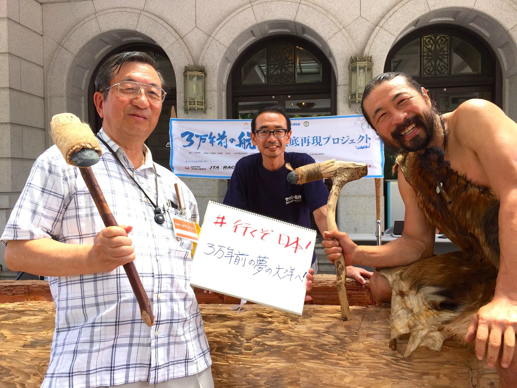 網友3万年前の航海 徹底再現プロジェクト圖為今年 8月7日,在日本東京的國立科學博物館的「三萬年前的航海計畫」特別活動上,志工(左)、領導「三萬年前的航海計畫」的人類史學家海部陽介(中)和飾演繩文時代的獨木舟工匠的雨宮(右)合影。