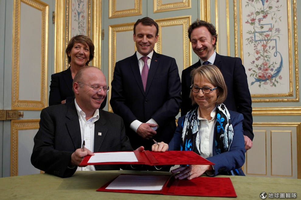 圖為今年 2月,在法國總統府艾麗舍宮(Elysee Palace),法國文化部長尼森(前排右)和文化遺產基金會的主席波伊蒂納(Guillaume Poitrinal,前排左)、法國總統馬克宏(後排中)、法國樂透彩(Francaise des Jeux)主席佩樂茲(Stephan Pallez,後排左)、伯恩(後排右)正在簽署「文化遺產樂透彩」的合約。
