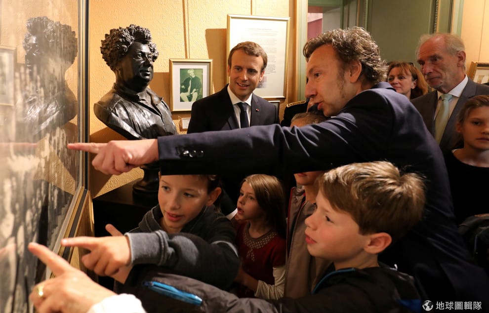 圖為 2017年9月,伯恩和法國總統馬克宏帶著一群學生們參觀位於馬里勒魯瓦(Marly-le-Roi)的Chateau de Monte-Cristo城堡,這裡是法國浪漫主義大文豪仲馬(Alexandre Dumas)的故居。