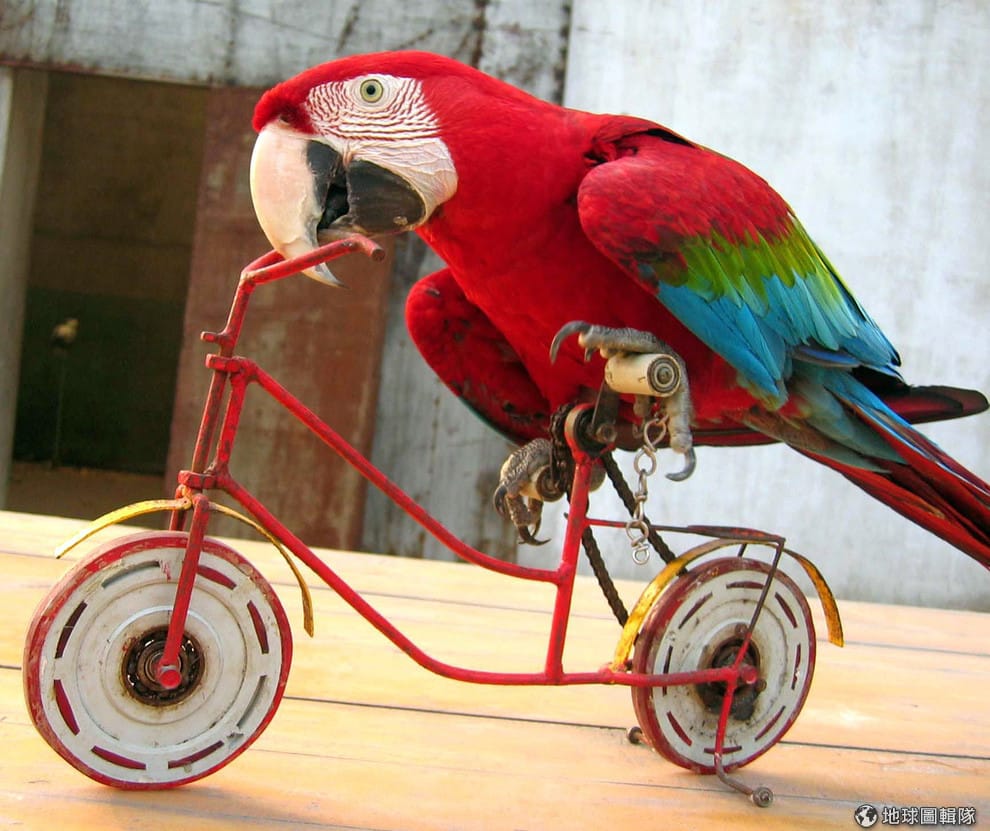 圖為 2006年1月,在中國江蘇省連雲港市,一隻鳥騎著特製腳踏車進行特技表演。